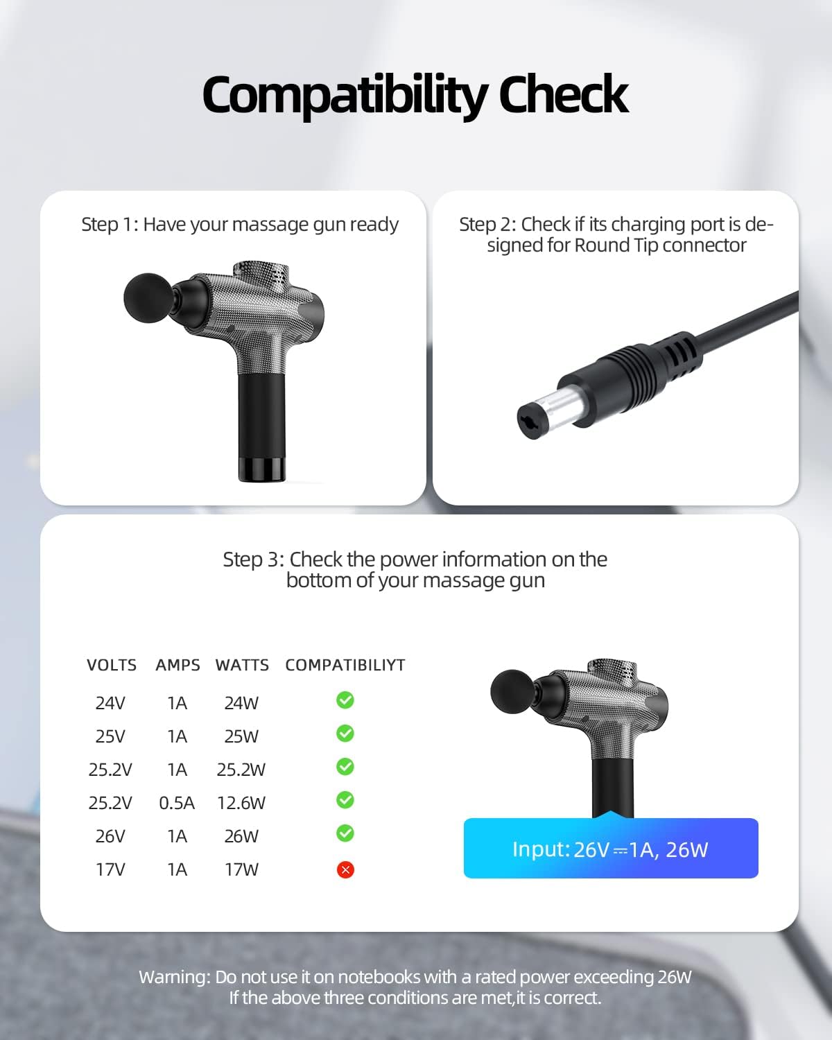 26V Charger for Toloco Massage Gun – Compatible with Toloco EM26,T11 Pro,TO-M63,FCA135-252010 Massage Gun 6FT Power Cord AC Adapter for Round Tip (Not USB-C)