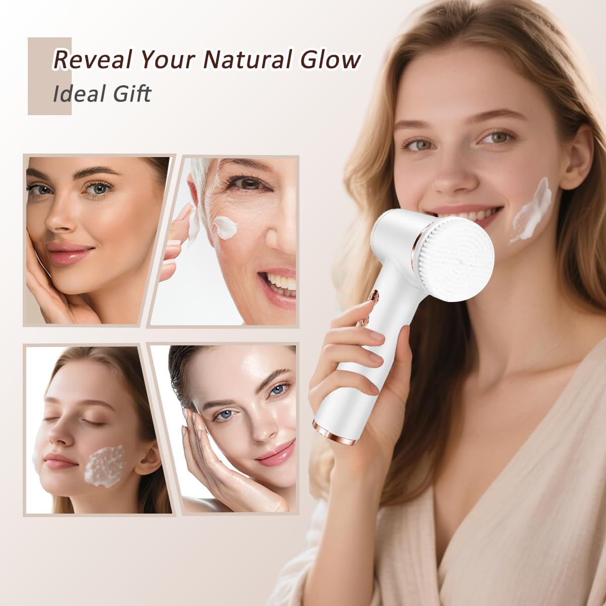 【Reveal Your Natural Glow】This beautiful and practical multifunctional electric facial cleansing brush can meet all your cleansing needs. In addition, this cleansing brush massages the skin after cleansing, helping to shrink pores and minimize blackheads, leaving the skin more refined and smoother, perfect for a natural glow. You can give it as an ideal gift to your family, friends or partner during the festive season.