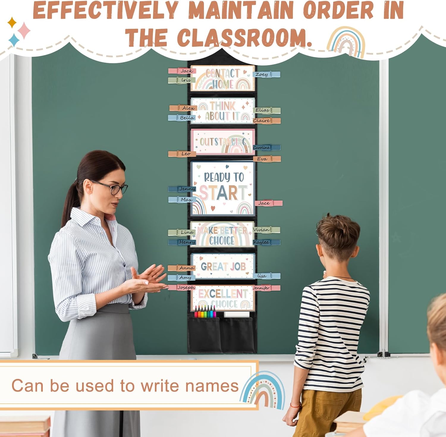 3 reviews for 67 Pcs Student Behavior Clip Chart for Classroom Management Boho Rainbow Track Reward Incentive Behavior Pocket Chart Kid Boho Bulletin Board Hanging Tool for Teacher Office Elementary School Supplies