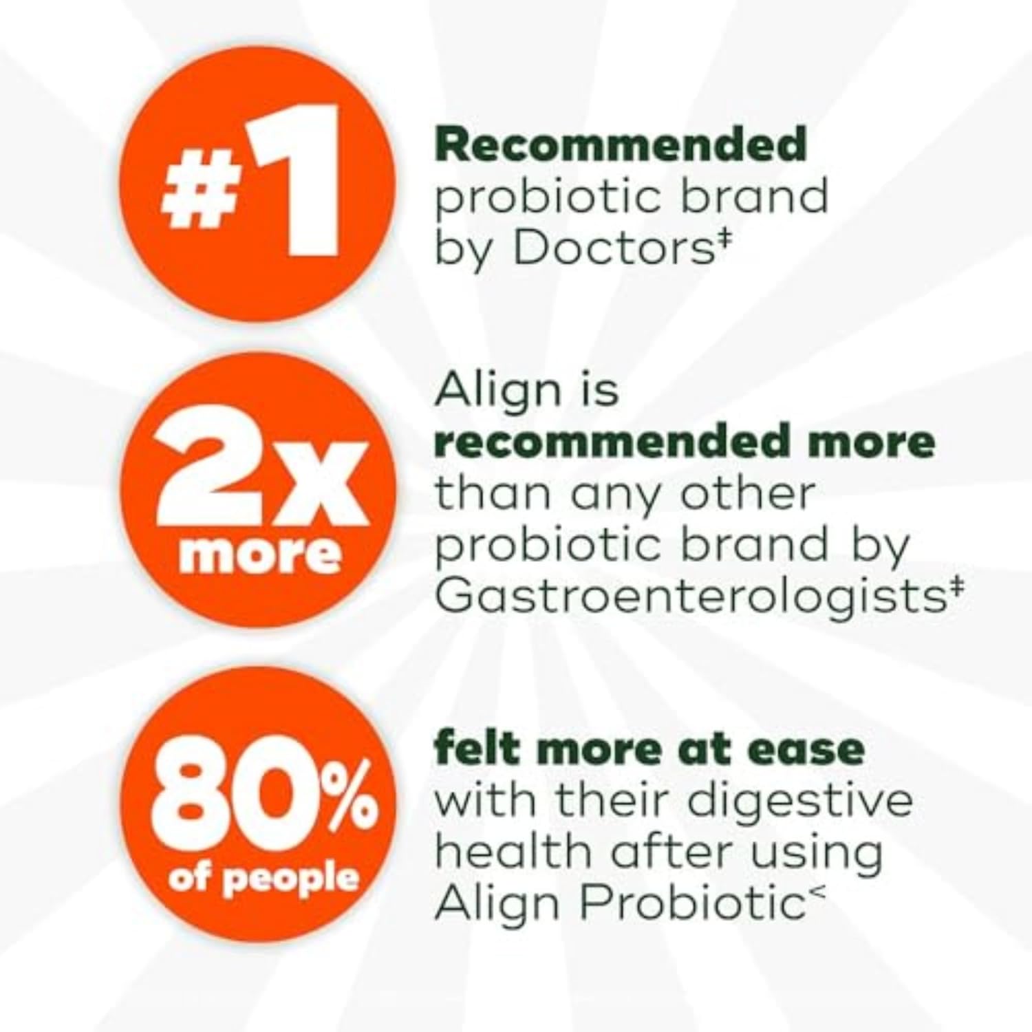 THE PROBIOTIC BRAND DOCTORS RECOMMEND MOST. Recommended by Gastroenterologists two times more than any other probiotic brand, Align is the #1 doctor and gastroenterologist recommended probiotic brand. Align 24/7 Digestive Support* contains the unique probiotic strain Bifidobacterium 35624 which was developed by Gastroenterologists and backed by 20+ years of research. The probiotic strain in Align 24/7 Digestive Support* naturally helps soothe occasional bloating, gas, and abdominal discomfort.* Align 24/7 Digestive Support* is vegetarian,does not contain gluten, and does not require refrigeration. *THESE STATEMENTS HAVE NOT BEEN EVALUATED BY THE FOOD AND DRUG ADMINISTRATION. THIS PRODUCT IS NOT INTENDED TO DIAGNOSE, TREAT, CURE, OR PREVENT ANY DISEASE. With continued daily use Among Doctors and Gastroenterologists who recommended a brand of probiotic in ProVoice 2023 survey In a survey of 104 adults who self-reported their occasional digestive issues were less bothersome during and after using Align Probiotic for 3 weeks.