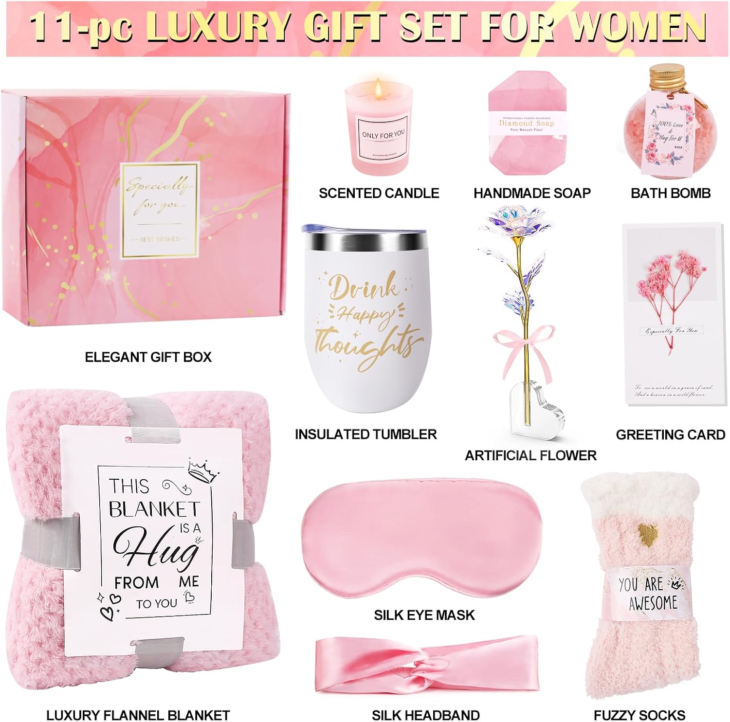 11PCS LUXURY SELF CARE GIFTS FOR WOMEN: Perfect as Mothers Day Gifts for Mom Mother in law, Christmas Gifts for Women, Relaxation Gifts for Women, Stress Relief Gifts, Valentines Day Gifts for Her Girlfriend Wife,11Pcs self care gifts for women:(1) Beautiful Gift Box ;(2) luxury flannel blanket;(3)12 Oz Insulated Tumbler;(4)rose scented candle(5)handmade soap; (6)bath bomb;(7) floral-scented soap;(8) silk eye mask;(9) silk headband;(10) fuzzy socks;(11) artificial flower gift card. Such a heart-warming Gifts for Women Birthday Unique!