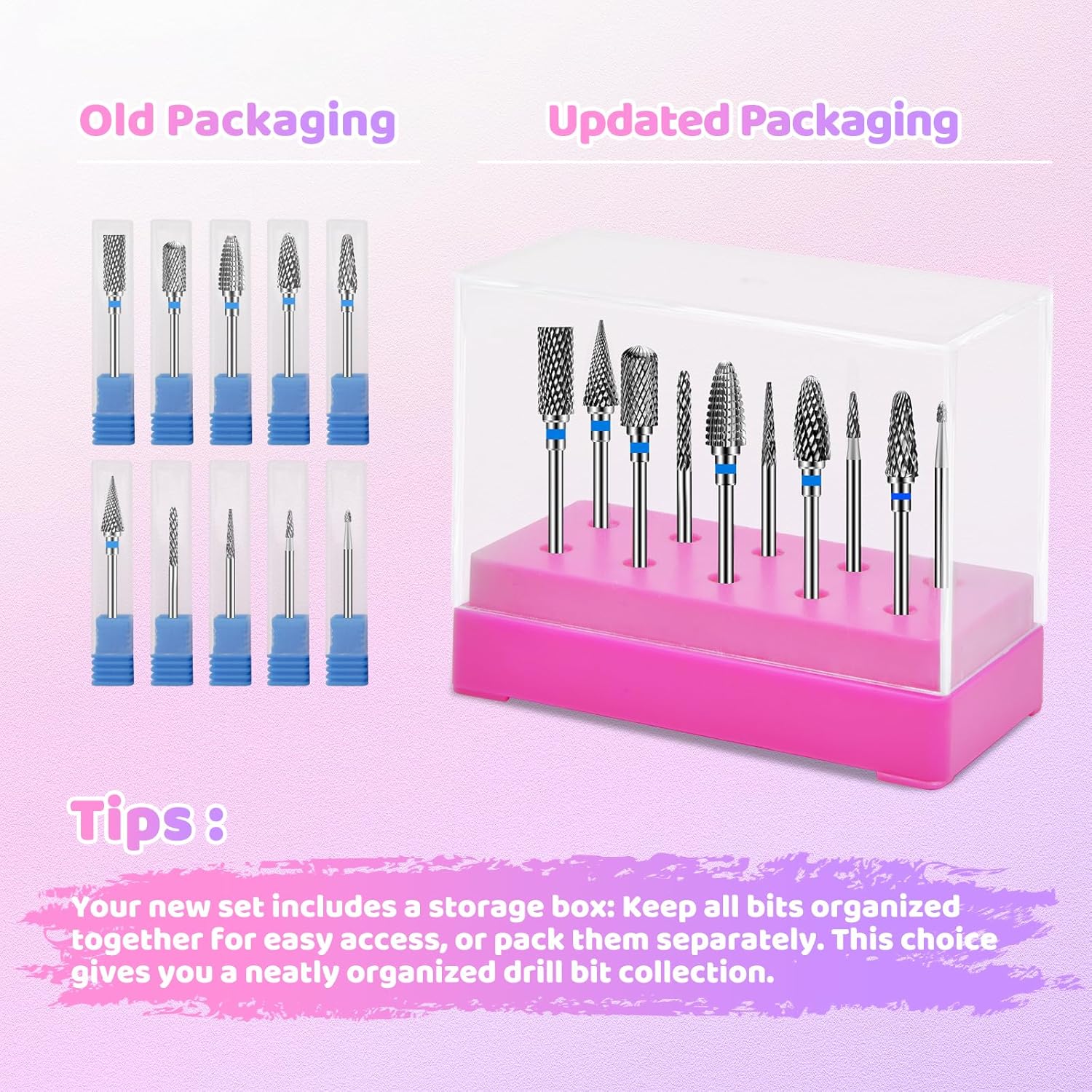 【10PCS Nail Drill Bits Set】: this nail drill bit set consists of 10 fine Tungsten Carbide Nail Bits of different grit sizes and 1 cleaning brush. Each drill bit can be used for cleaning, trimming or Acrylic Nails Remover tasks on different nail areas, such as crystal nail polishing, shaping, cuticle removal, gel nail chip removal and more