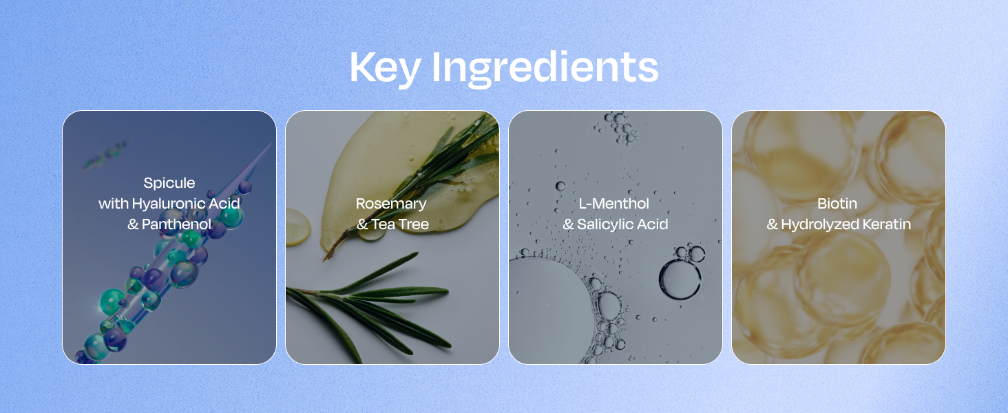 SPICULE SERUM WITH HYALURONIC ACID & PANTHENOL Formulated with spicules coated in Hyaluronic Acid and Panthenol, this lightweight serum helps deliver moisture to dry, itchy scalps. It gently supports scalp hydration and comfort—without irritation or greasiness.