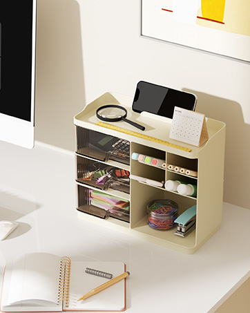 Sleek and Efficient Storage: This vanity organizer, featuring three drawers and four inclined slot compartments, doubles as a makeup brush holder. It has the capacity to store a wide range of beauty items neatly, including lipsticks, eyeshadows, foundation, and so on.
