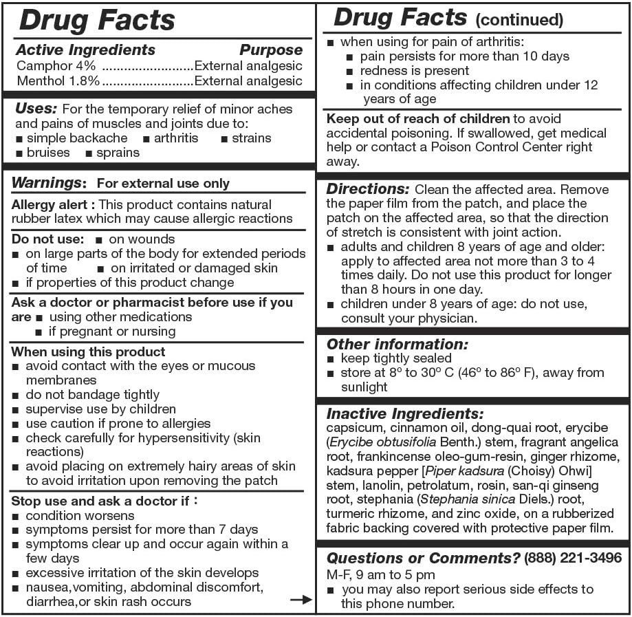 Each Patch: 2.75 in x 4 in (7 cm x 10 cm) 5 Patches Per Pouch Works up to Eight Hours Uses: For the temporary relief of minor aches and pains of muscles and joints due to: simple backache arthritis strains bruises sprains